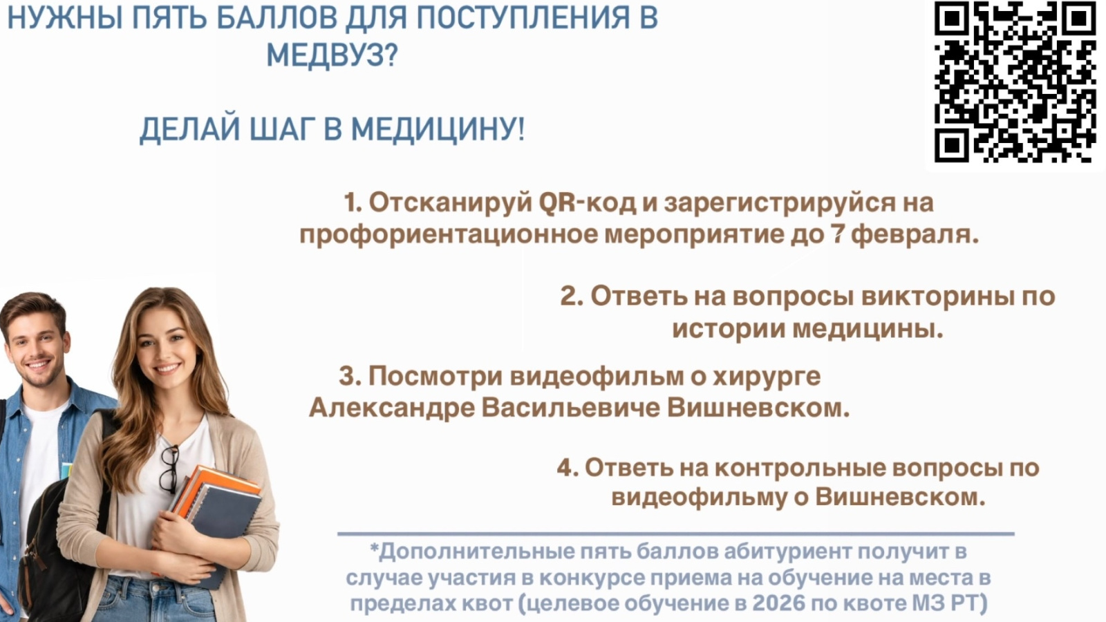 Дополнительные пять баллов абитуриент получит в случае участия в конкурсе приема на обучение на места в пределах квот (целевое обучение в 2026 по квоте МЗ РТ).